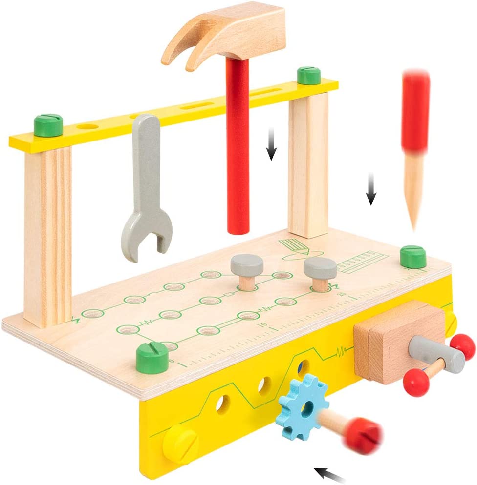 [ Rich in Color ] - This wooden workbench all parts colour is bright, More attractive to toddlers. Multiple simulation wooden tools are designed for children to enhance the authenticity and let children give full play to their creativity. Include, wooden toy wrench, saw, hammer, screwdriver, screw