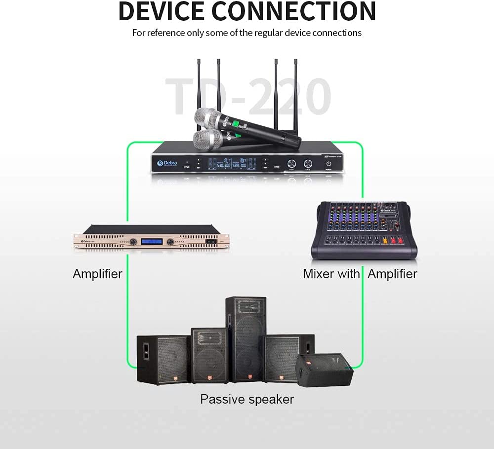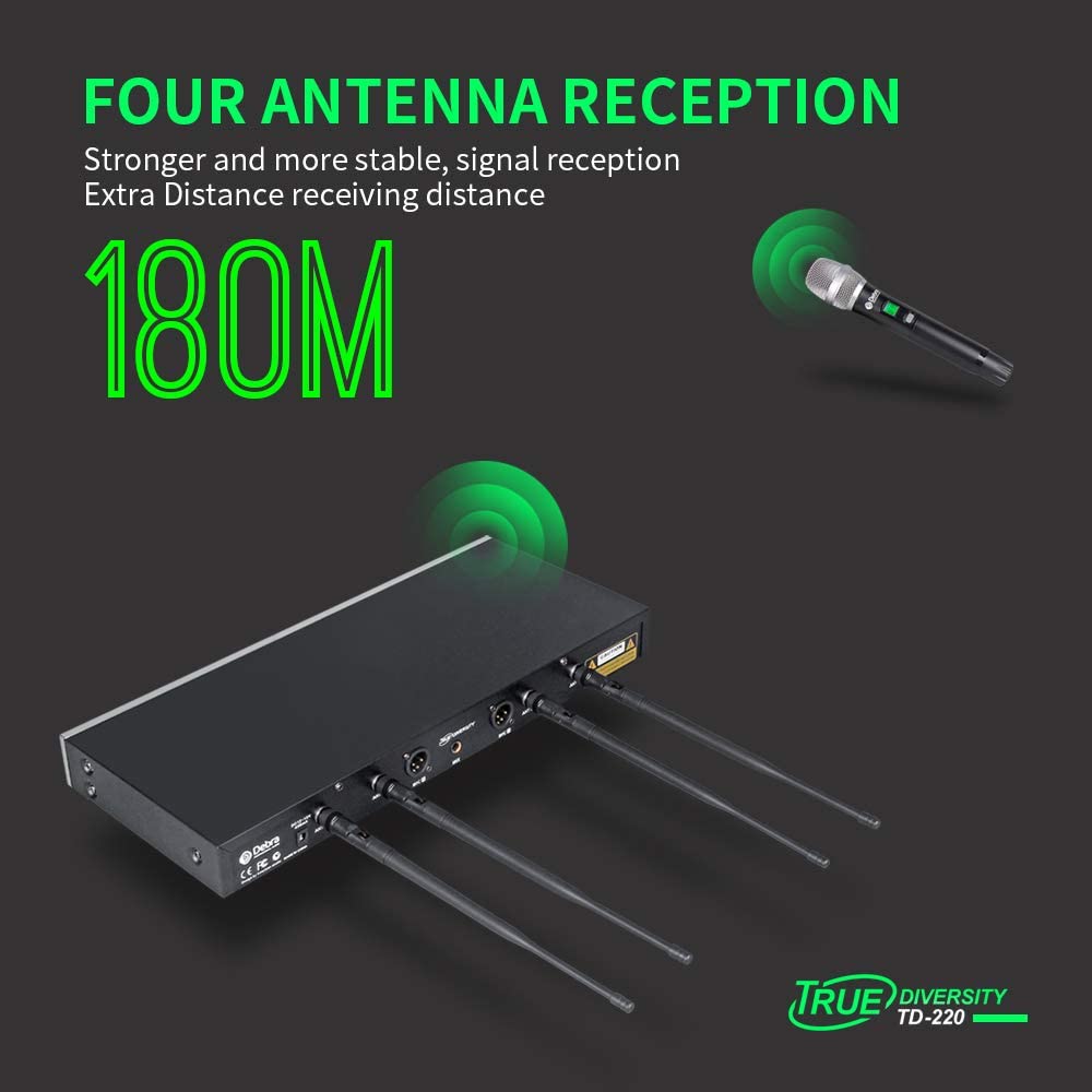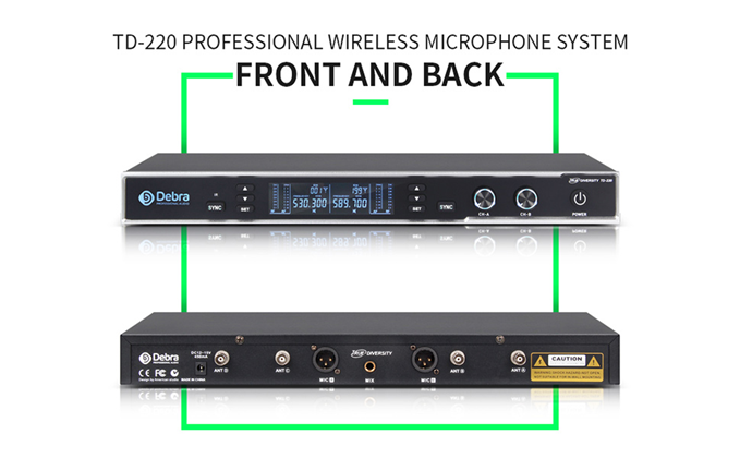 D Debra Audio TD-220 is true diversity dual microphone four receive and antenna, effectively overcome the frequency of dead ends, UHF band, PLL digital frequency synthesis. The Optimal distance arrived 650 Foot operation range.