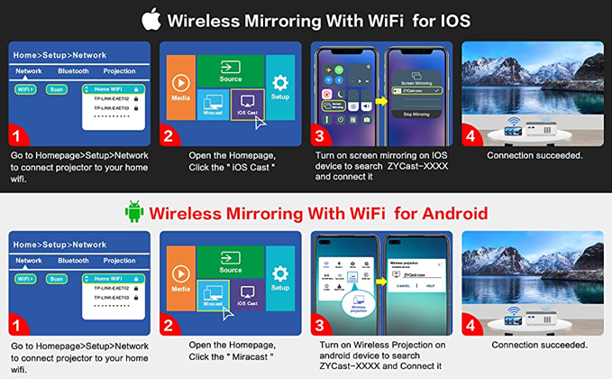 1. Turn on your wifi projector, go to setup page to connect your projector with your home wifi