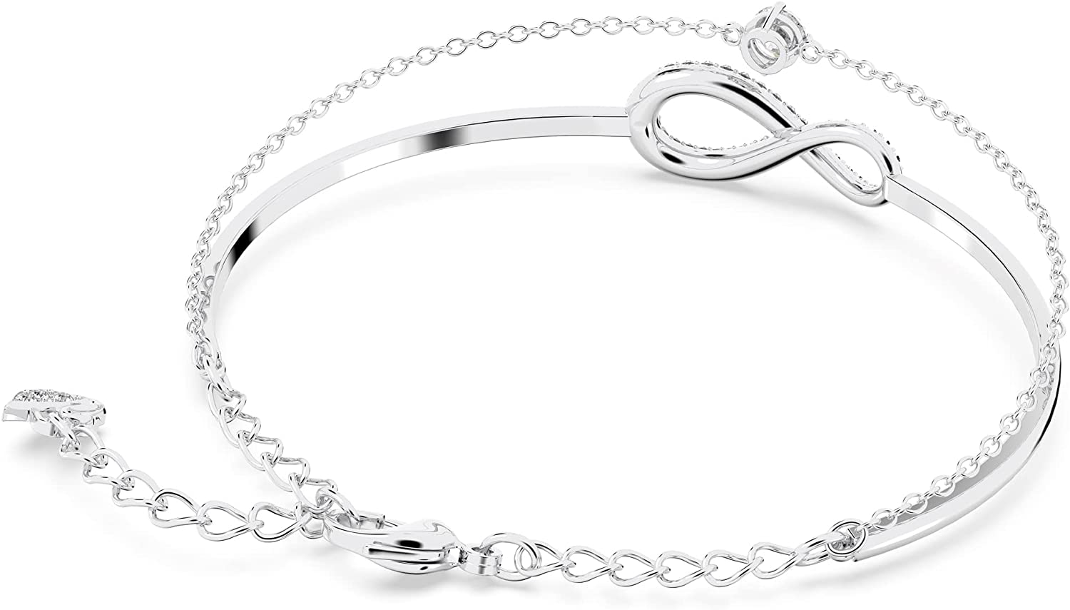 Items delivered: 1 x Swarovski Infinity bangle bracelet for women, 2 1/4 / 1 3/4 inches rhodium plated band and chain, white crystal infinity symbol and clasp closure, with Swarovski bracelet box