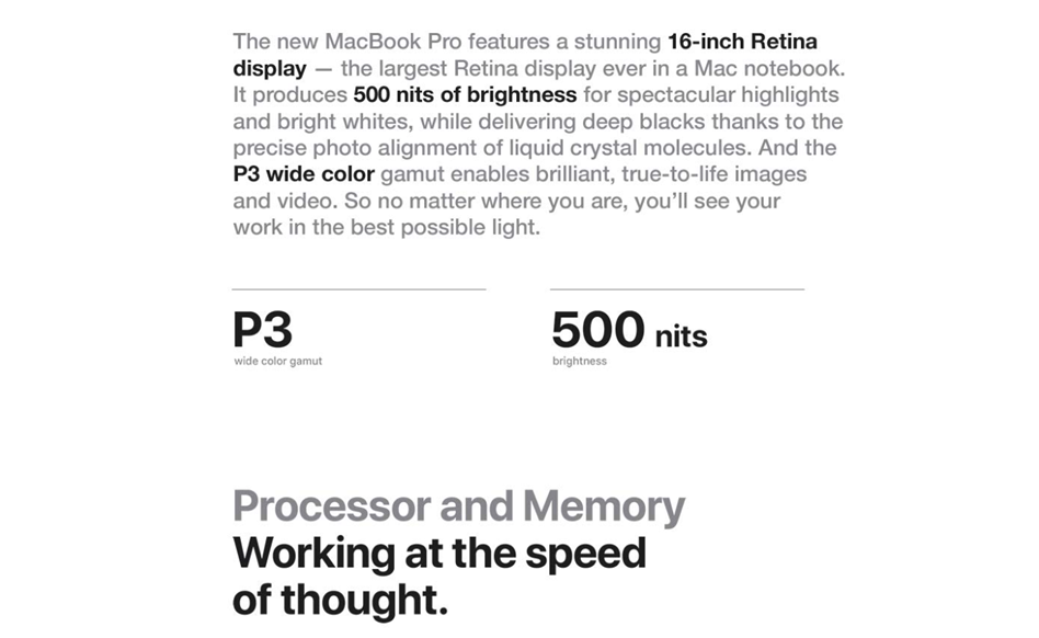 | Display | 16.0-inch (diagonal) LED-backlit display with IPS technology; 3072x1920 native resolution at 226 pixels per inch with support for millions of colors |