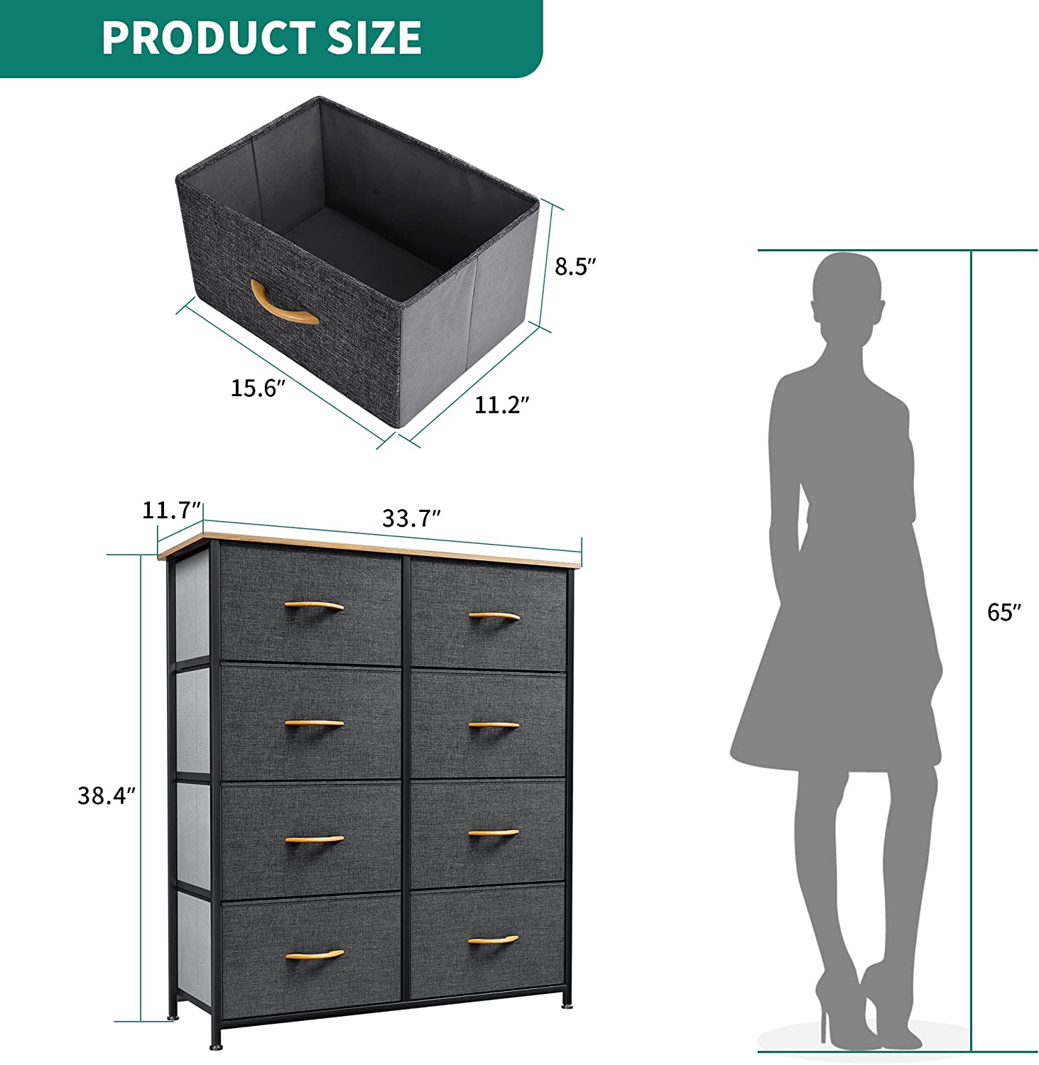 SAFE & EASY USE- Overall size: 33.7" L x 11.7" W x 38.4" H, Drawer Dimensions: 15.6" L x 11.2" W x 8.5" H; It’s a breeze to assemble the storage unit with instructions included; Recommended to anchor the grey dresser to the wall for anti-tipping safety