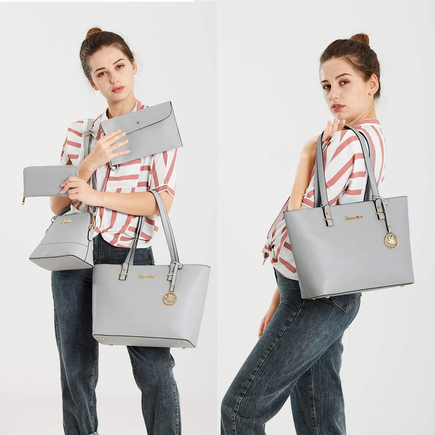 【Pockets】 Tote bag: One main compartment with one interior zipper pocket and two slot pockets. 5pcs purse set include large tote handbag, messenger bag, wallet, clutch and card holder. The purse set can hold your iPad, wallet, makeups, phone, little water bottle, perfumes, gloves and other daily use and keep them organized.
