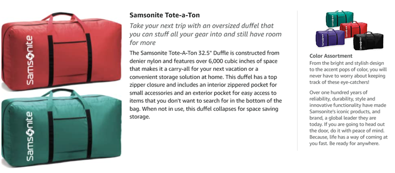 Durable yet Lightweight duffel holds as much as a trunk with over 6,000 cubic inches of space, it works great for travel or storage its uses are endless; Zippered interior Pocket is perfect for small items such as keys, and exterior pocket offers easy access collapsible for easy storage when not in use.
