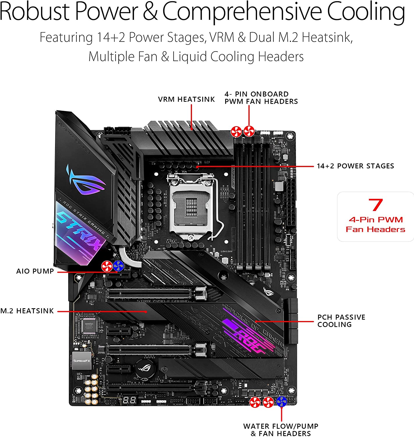 The ROG Strix Z490-E (WiFi 6) Gaming motherboard is designed to cope with the demands of 10th Generation Intel Core processors, with boosted power delivery and an optimized cooling design providing more surface area for heat dissipation. ROG Strix Z490-E Gaming features AI enhancements and intuitive dashboards to help you overclock and tweak various parameters easily