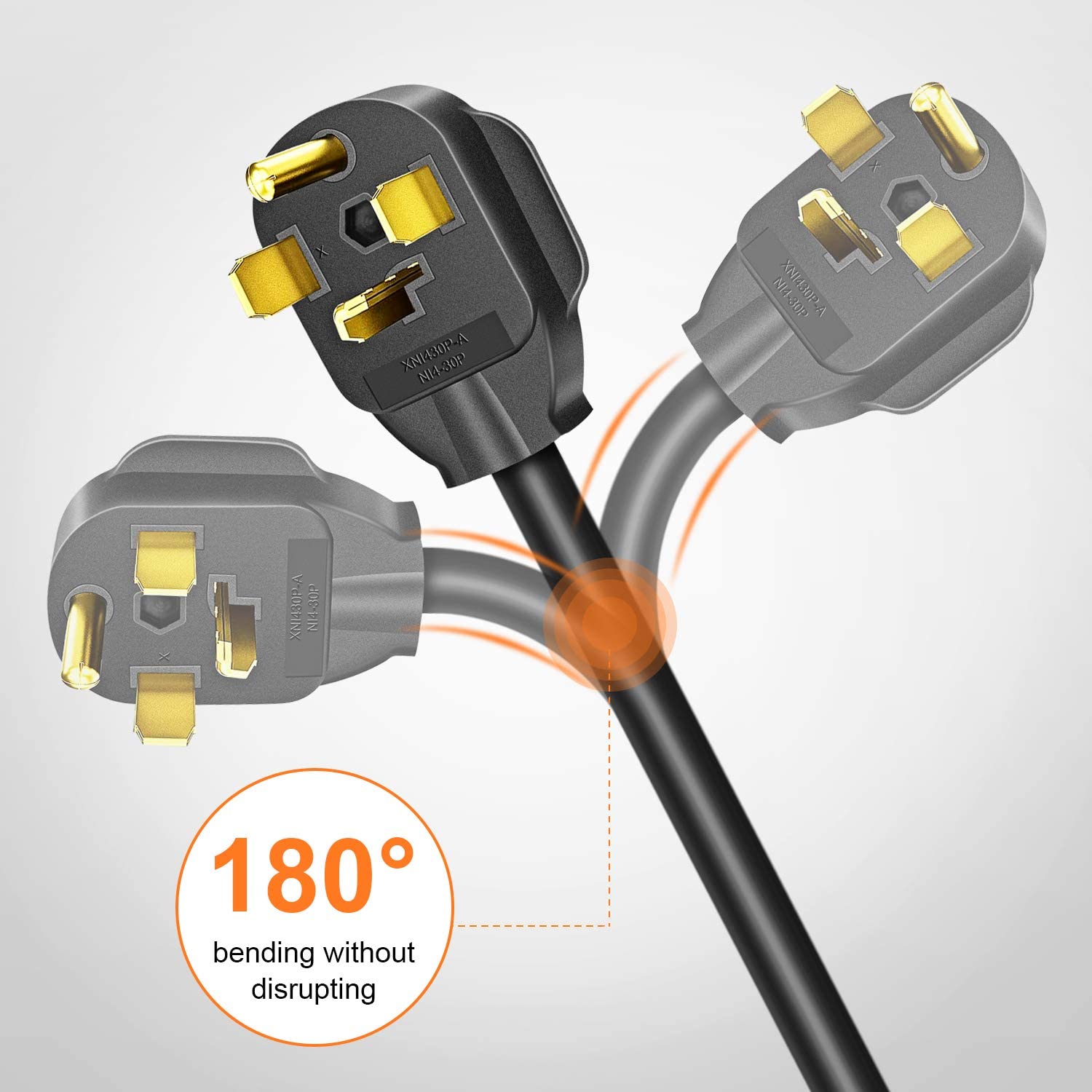 - Product Specification: NEMA 14-30P 4-prong plug 125V/250V molded male. NEMA 10-30R 3-prong socket 250V molded female connector. Both are right angle, 30 AMP, Max wattage 7500 watts, 1.5 FT.