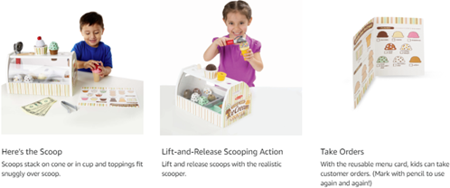 Scoop up some cool treats with this all-inclusive, 28-piece pretend play ice cream counter! The sturdy wooden tabletop counter holds eight wooden scoops of different-flavored ice cream, six assorted toppings, two cones, a plastic cup, an ice cream scooper, tongs, and a wooden spoon. The scooper fits into a hole on top of the scoops to lift, stack, and release. Take orders on the reusable menu card, pay with play money, and serve up delicious fun! This 28-piece wooden ice cream play set allows children 3 and up to scoop different flavors of ice cream and interact with their friends in a playful social environment. The scooper is easy to use and replicates the realistic action of serving ice cream. The Wooden Scoop & Serve Ice Cream Counter makes a great gift for kids ages 3 and up. For more dessert-making fun, consider adding the Melissa & Doug Wooden Make-a-Cake mixer set or the Melissa & Doug Bake & Decorate Cupcake set. This kids ice cream station contains 28 pieces with packaging that measures 13.6" x 7.7" x 8.6". For more than 30 years, Melissa & Doug has created beautifully designed imagination- and creativity-sparking products that NBC News called “the gold standard in early childhood play.” We design every toy to the highest-quality standards, and to nurture minds and hearts.