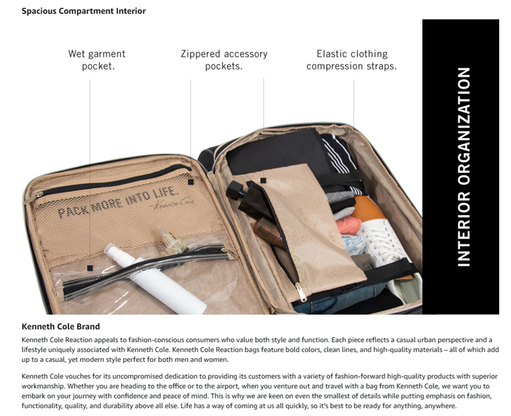 Finally, travel made trendy with the stylish polyester-twill chevron luggage from Kenneth Cole Reaction’s Chelsea luggage collection. Complete with a fully lined, tear-resistant interior, this luggage also expands an additional 2.0 inches, ensuring that you have plenty of space for all your needed belongings. Its lightweight construction helps you meet airline weight restrictions to avoid unnecessary airport fees, while its 8-wheel spinners provide effortless 360-degree navigation allowing you to glide quickly through the airport. The main compartment interior features a hanging side zipper pocket and garment restraints to hold belongings in place. The under-the-lid section includes a mesh zipper pocket and a transparent, clear PEVA gusseted pocket for toiletries. The front exterior also features a small zipper pocket for easily accessible items and a large gusseted zipper pocket for additional storage organization. Padded top and side handles allow for easy maneuvering, and a bottom grab handle allows for easier lifting. Additionally, a retractable trolley handle extends to be 41 inches tall with a locking push button mechanism. Fashionable and functional, Chelsea luggage also boasts fashion-forward gold hardware with premium self-repairing coil zippers designed for long-lasting use. Carry-on size meets most U.S. based airline carry-on size requirements and fits into most airline overhead bin compartments. Backed by a manufacturer 10-year limited warranty. ★ Overall Dimensions: 22.0” H” x 14.0” L x 9.0”-11.0” D. ★ Packing Dimensions: 20.0” H x 13.5” L x 8.5”-10.5” D. ★ Weight: 6.35 lbs. ★