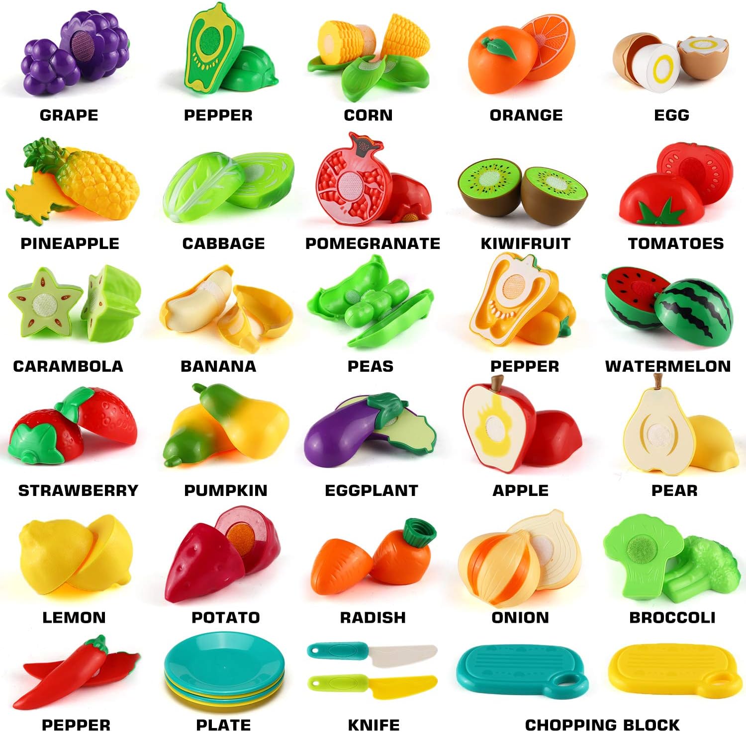 35 items pretend play food set for toddlers: 26 different kinds of play fruit and vegetables (can be separated into 61 small pieces), a toy grocery basket, 2 cutting boards, 2 kitchen knives, and 4 dinner plates.