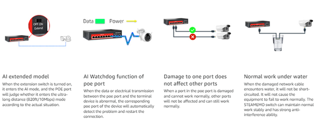 【AI 250 meters Extend function】Turn on the extension switch,it enters the AI mode,POE port will judge whether it enters the ultra-long distance (820ft/10Mbps) mode according to the actual situation).Extend function extending max power and data transmission distance from 100 meters(330ft) to 250 meters(820ft).which is easy to expand network via ethernet cable to somewhere without power supply but need fix device such as IP Cameras.