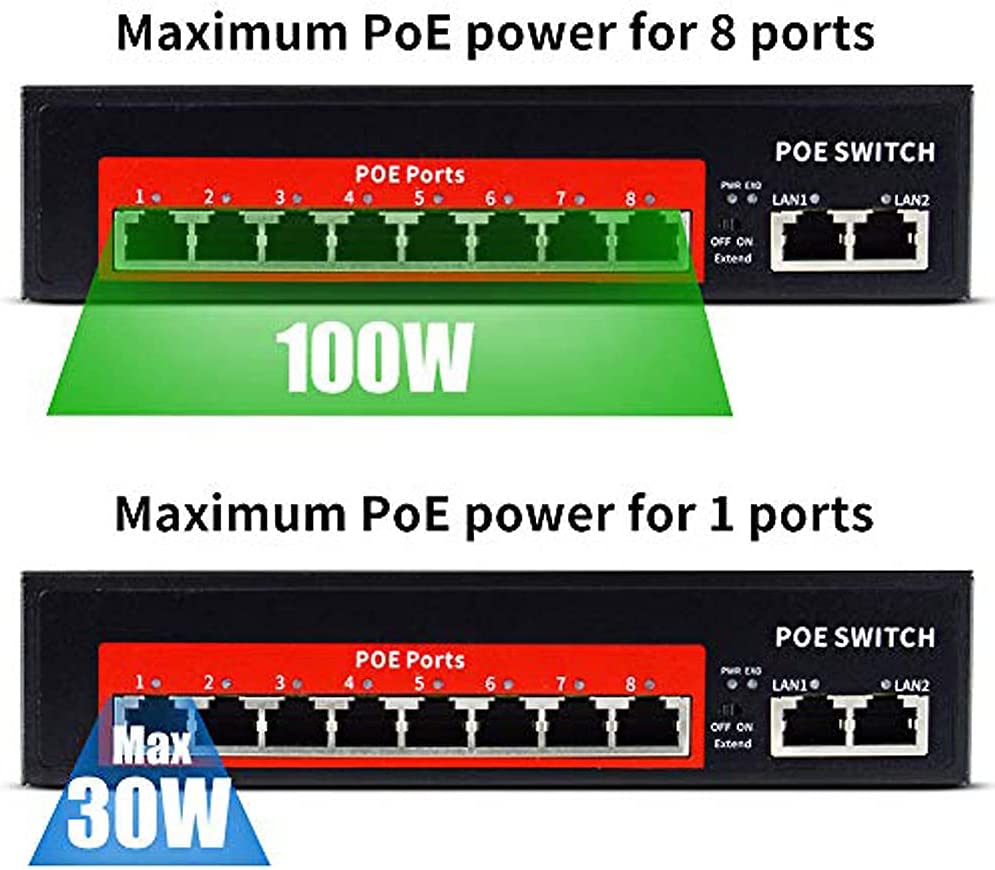 【8 port poe switch*100M@120W 】PoE switch with 8 port PoE + 2 Uplink port,8× PoE ports providing up to 30W per port, total PoE budget 120W,2 port uplink ideal for connecting NVR and Internet, etc.