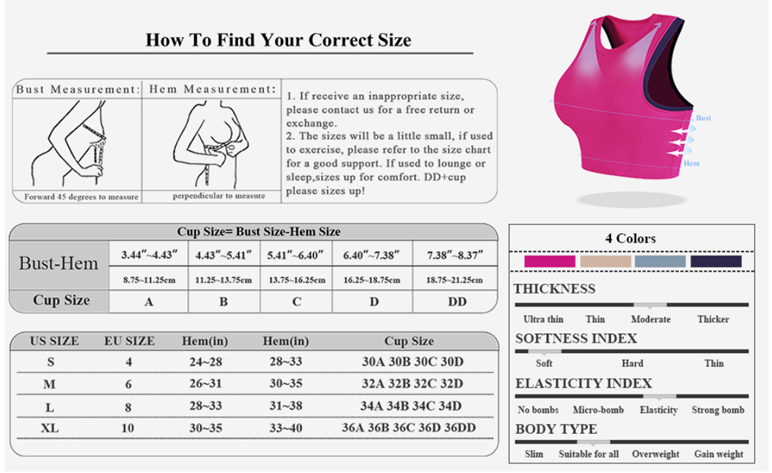 Size Recommended: S fit for 30A 30B 30C 30D; M fit for 32A 32B 32C 32D; L fit for 34A 34B 34C 34D; XL fit for 36A 36B 36C 36D 36DD.