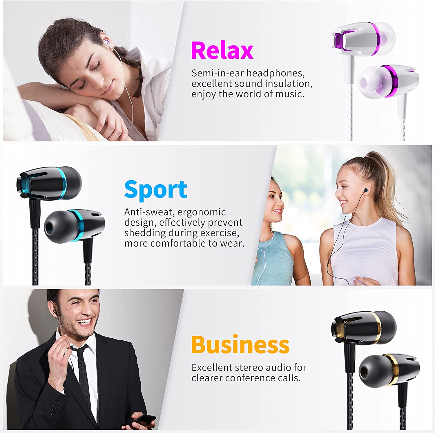 [Ergonomics Design]: The earphones are ergonomically designed, flexible, lightweight, allowing you to comfortably wear for long periods of time, the ear tips are soft and excellent quality, it comes with two additional different sizes of buds (M/L), you can choose the better buds to fit your ears.