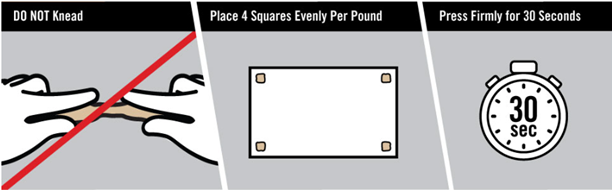 Directions:1. Ensure both surfaces are clean and dry.2. Remove desired amount of putty squares for application. Use directly from package without kneading and apply approximately 4 squares of putty per 1lb of weight. Not recommended for hanging objects over 2lbs.3. Apply square(s) to the object being mounted allowing for even distribution of weight.4. Press object firmly in place for 30 seconds to allow Gorilla Mounting Putty to conform to the surface and create a strong bond.