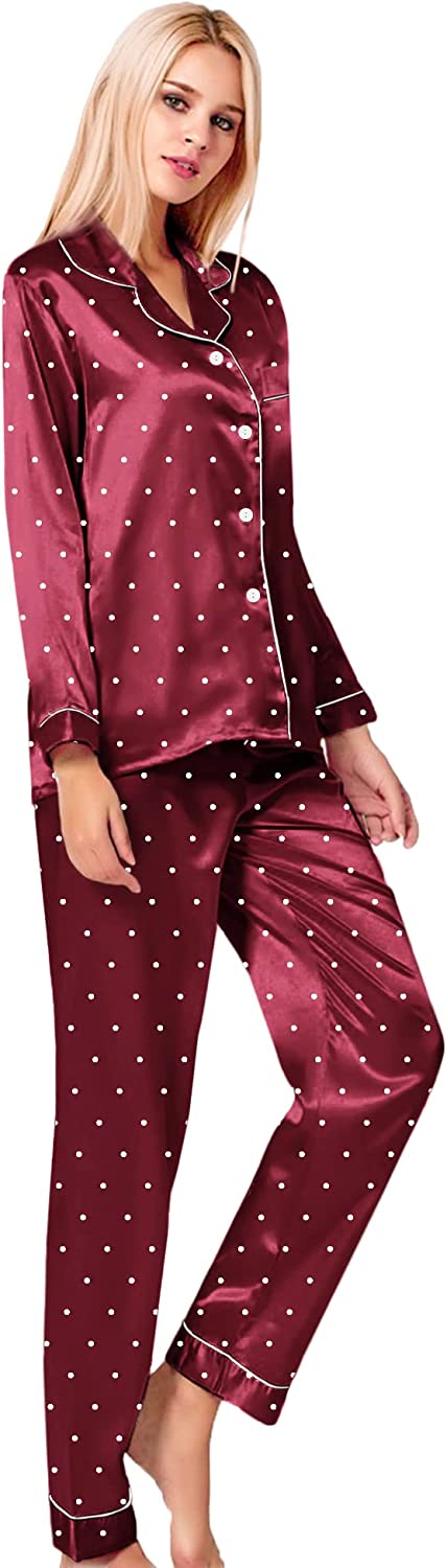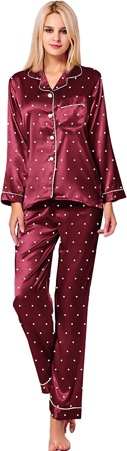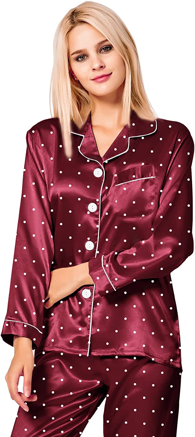 SWOMOG Womens Silk Satin Pajamas Loungewear Two-piece Sleepwear Button-Down Pj Set