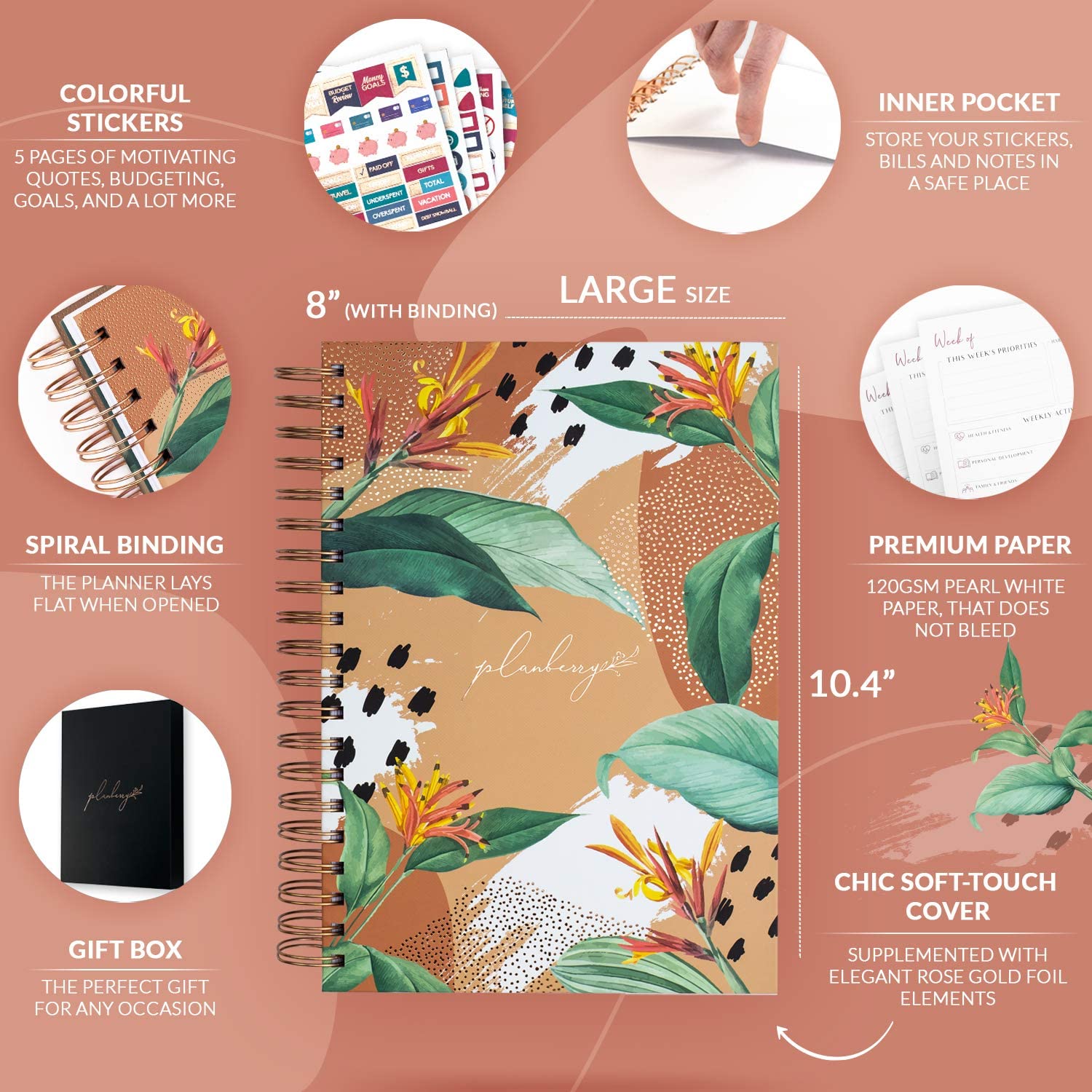 - ✓ PREMIUM EDITION DESIGN, GIFT BOX & EXTRAS – This premium edition agenda planner is made using high-quality materials and has a soft-touch hardcover with rose gold detailing, sturdy double wire binding, thick 120gsm bleed-resistant paper, and a back pocket for loose notes. The day planner comes inside an elegant gift box, with 6 sheets of colorful stickers and a detailed user guide with step-by-step instructions.