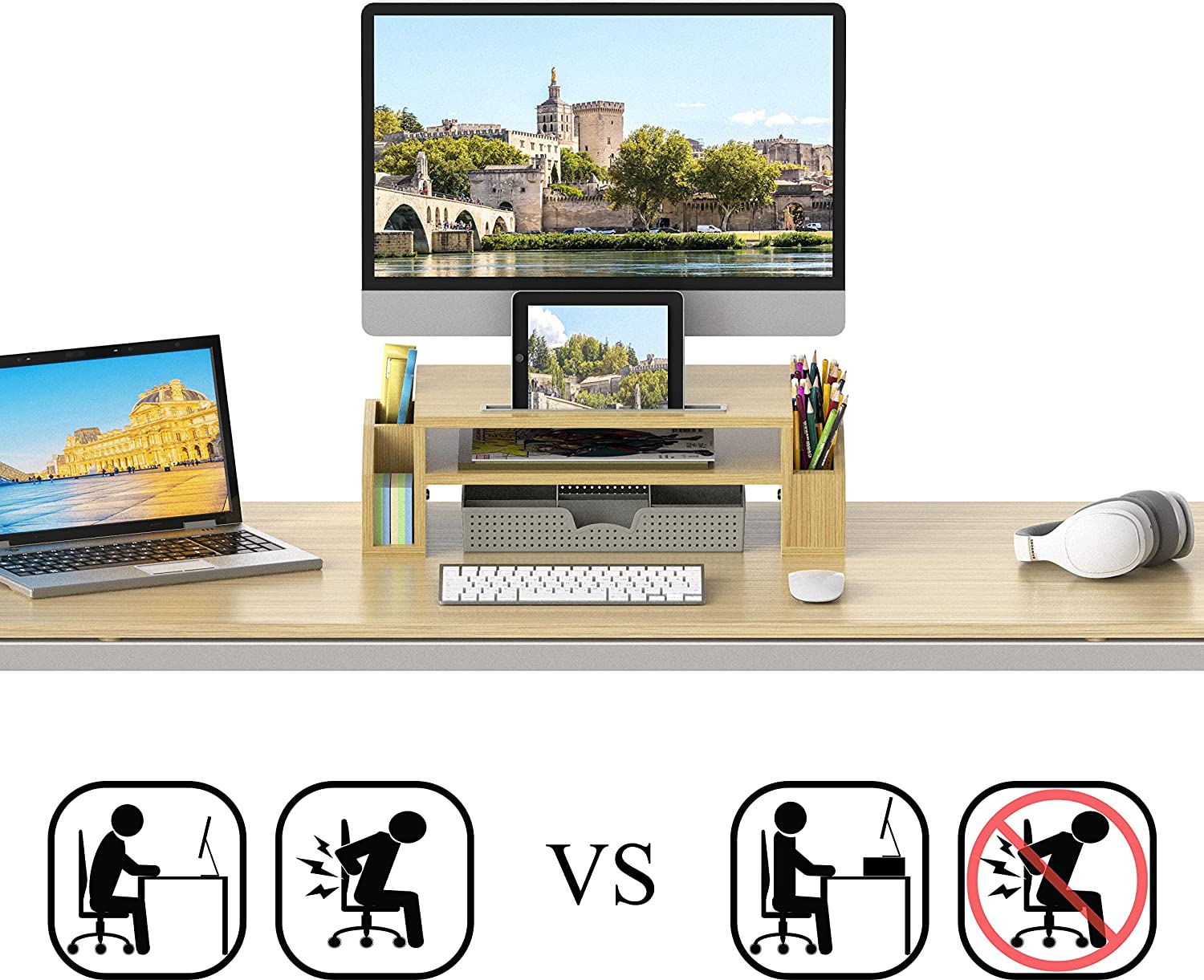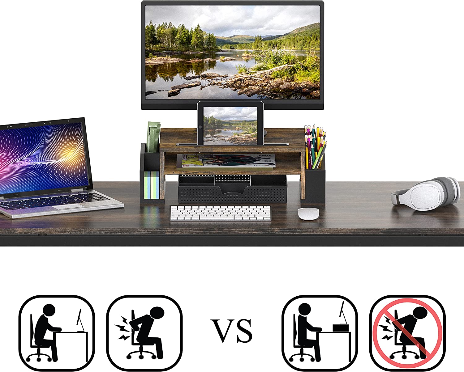 Raises your monitor to a comfortable viewing height. Reduce neck and eye Strain.