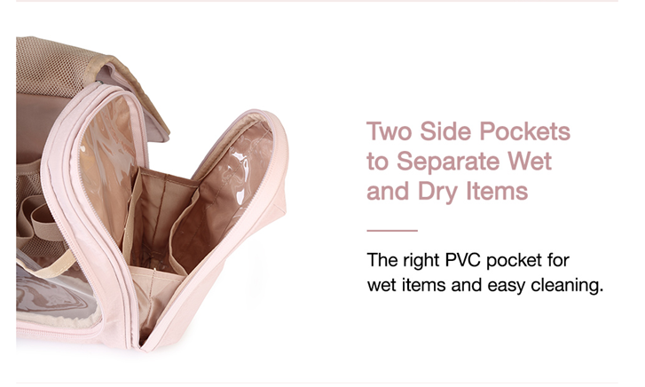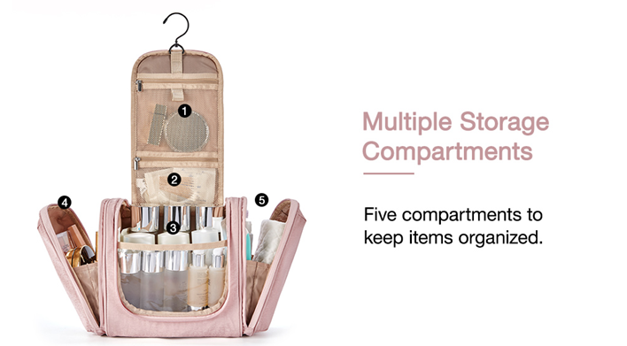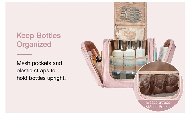 Special Design - Inner pockets with elastic straps hold bottles upright. Two side pockets of travel toiletry bag can keep the wet/dry items separated. The right side pocket with PVC material is easy to clean and dry, perfect for makeup brushes, toothbrushes, wet towels. Stow-away 360 degree swivel non-slip metal hook for versatile hanging options.Can be gifts for Women on Black Friday,Cyber Monday,Christmas day.