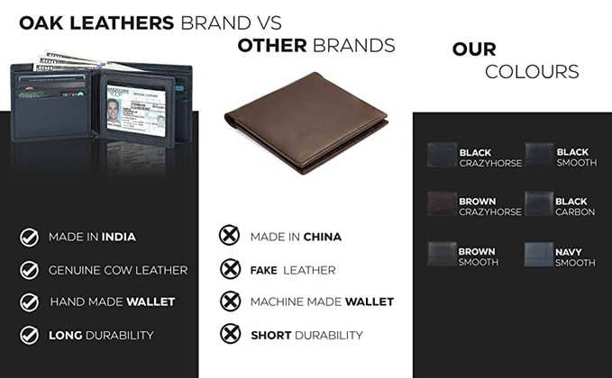 - ★REAL LEATHER : Oak Leathers wallet are MADE IN INDIA products and that comes in various Leather Quality. Oak Leathers manufactures only REAL authentic Leather Porducts which is tanned in India. The Tanning process includes Vegetable Tanning where we use extracts of Oak Bark to make the Leather Softer and rich in Looks.
