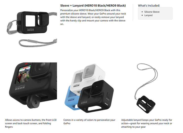 Personalize your GoPro with this premium silicone sleeve. Wear your GoPro around your neck with the sleeve and lanyard, or easily remove your lanyard with the quick-release clip and mount your camera with the sleeve on. Perfect for protection from scratches while on the go.