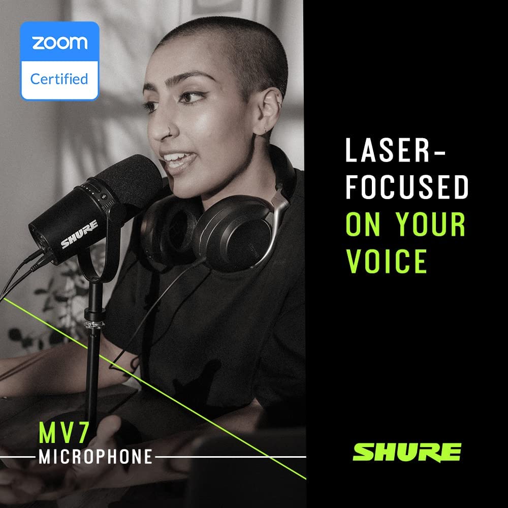 Shure MV7 USB Microphone for Podcasting, Recording, Live Streaming & Gaming, Built-in Headphone Output, All Metal USB/XLR Dynamic Mic, Voice-Isolating Technology, TeamSpeak & Zoom Certified – Black