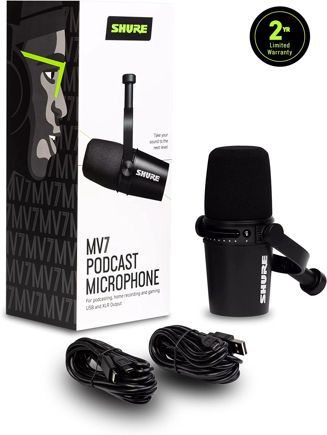 • WHAT’S IN THE BOX - Shure MOTIV MV7 Podcast Microphone with 10 ft (3m) USB-A cable and 10 ft (3m) USB-C cable. Free 2-YEAR WARRANTY included.
