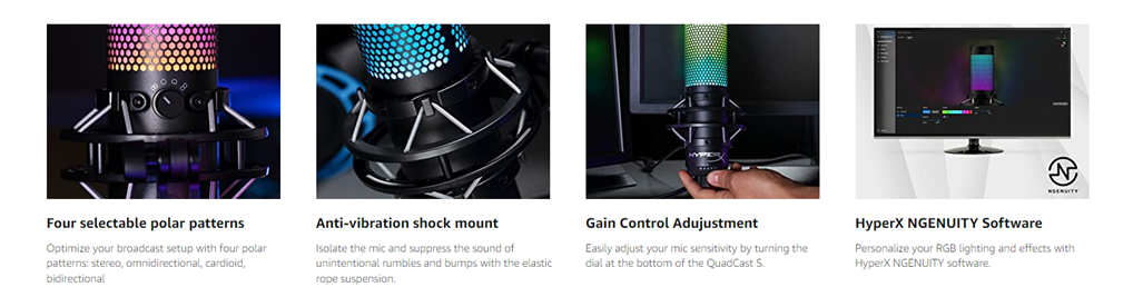HyperX QuadCast S – RGB USB Condenser Microphone for PC, PS4, PS5 and Mac, Anti-Vibration Shock Mount, 4 Polar Patterns, Pop Filter, Gain Control, Gaming, Streaming, Podcasts, Twitch, YouTube, Discord