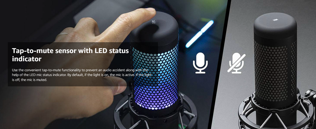 Tap-to-mute sensor with LED status indicator: Use the convenient tap-to-mute functionality to prevent an audio accident along with the help of the LED mic status indicator. If the light is on, the mic is active, if the light is off, the mic is muted.