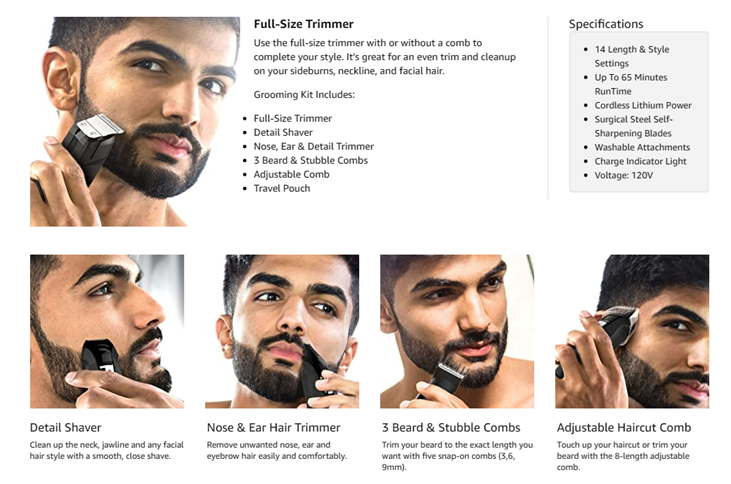 • 14 Settings for All Your Grooming Needs – Full-Size Trimmer; Nose, Ear, & Detail Trimmer; Detail Shaver; 8-Length Hair Clipper Comb; 3 Snap-On Beard and Stubble Combs