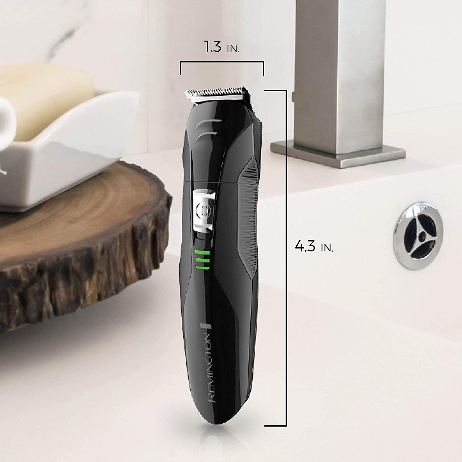 Color:Black The REMINGTON All-In-One Grooming Kit gives you the power of precision with complete versatility for all of your grooming needs. The kit includes: a full- size trimmer; foil shaver; nose, ear and detail trimmer; hair clipper comb with 8 length settings; three beard and stubble combs; and a storage/travel pouch. The rechargeable lithium battery provides up to 70 minutes of cordless runtime. Achieve the style you desire with self-sharpening, surgical steel blades that stay sharp and are long-lasting. The textured grip fits firmly in your hand for ultimate control at any angle. The washable attachments can be rinsed under a faucet for easy cleaning.