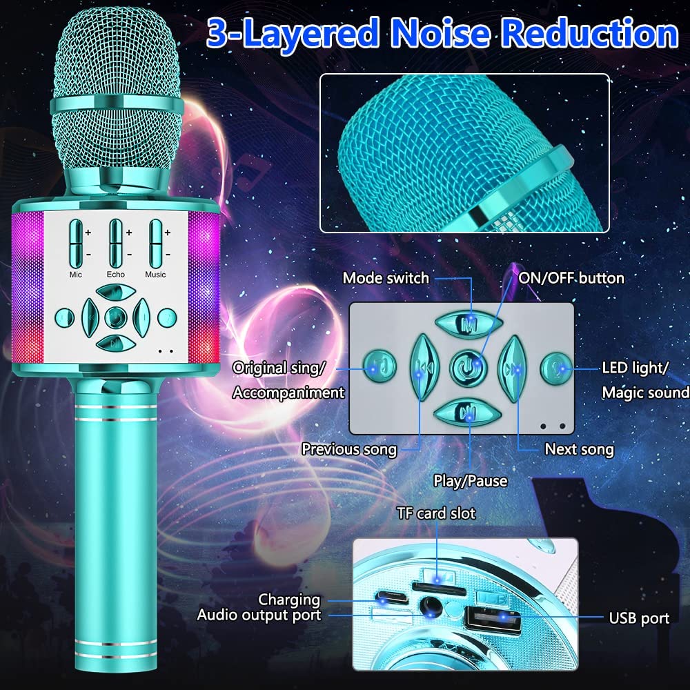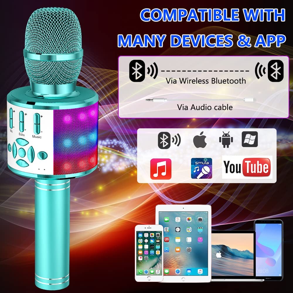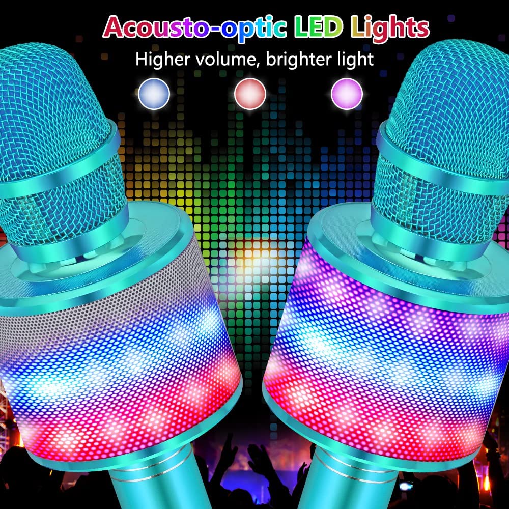 • 【Magic Sound + Multi-Colored LED Lights】Advanced 3-layers noise reduction technology will ensure high-quality, crystal-clear sound. Stunning KTV live-sound, and clear music rhythm with echo reverberation. With 4 magic sound modes to change your voice. And circled Multi-Colored LED Lights, LED Lights will dancing with your voice or music, makes party more happy.