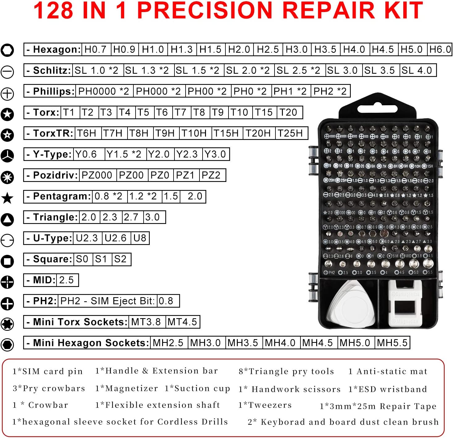 【Repair Tool Kits】The repair screwdriver kit has a non-slip rubber handle, 3mm phone repair tape, mini sucker, bendable flexible extension shaft, and an adapter for an electric screwdriver, cleaning brush, prying tool, precision tweezers, magnetizer, etc. All of the repair tools will help you in the DIY or repair procedure.
