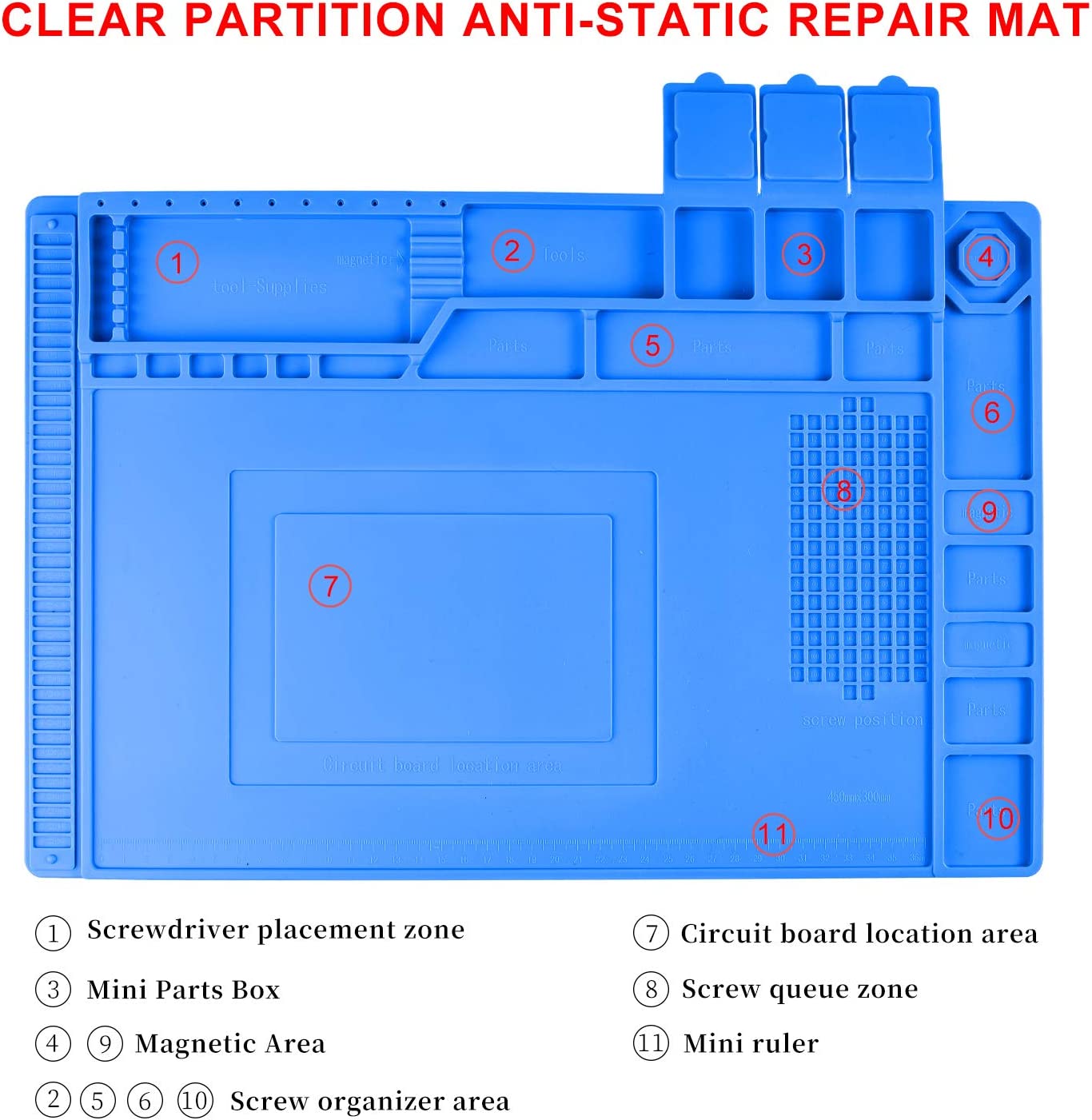 【Magnetic Anti Static Mat】The silicone heat-resistant mat can withstand high temperatures of 500°C(932°F), it is a necessary tool for electronics repair. This big ESD mat has a large enough working area, 17.8*11.8 Inches (45cm*30cm), and it has a clear functional zone, such as a magnetic zone, screw placement zone, parts store box, screwdriver zone, 36 cm scale ruler. You no longer have to worry about screw bits or small parts becoming messy or missing when you are doing DIY or repairing.