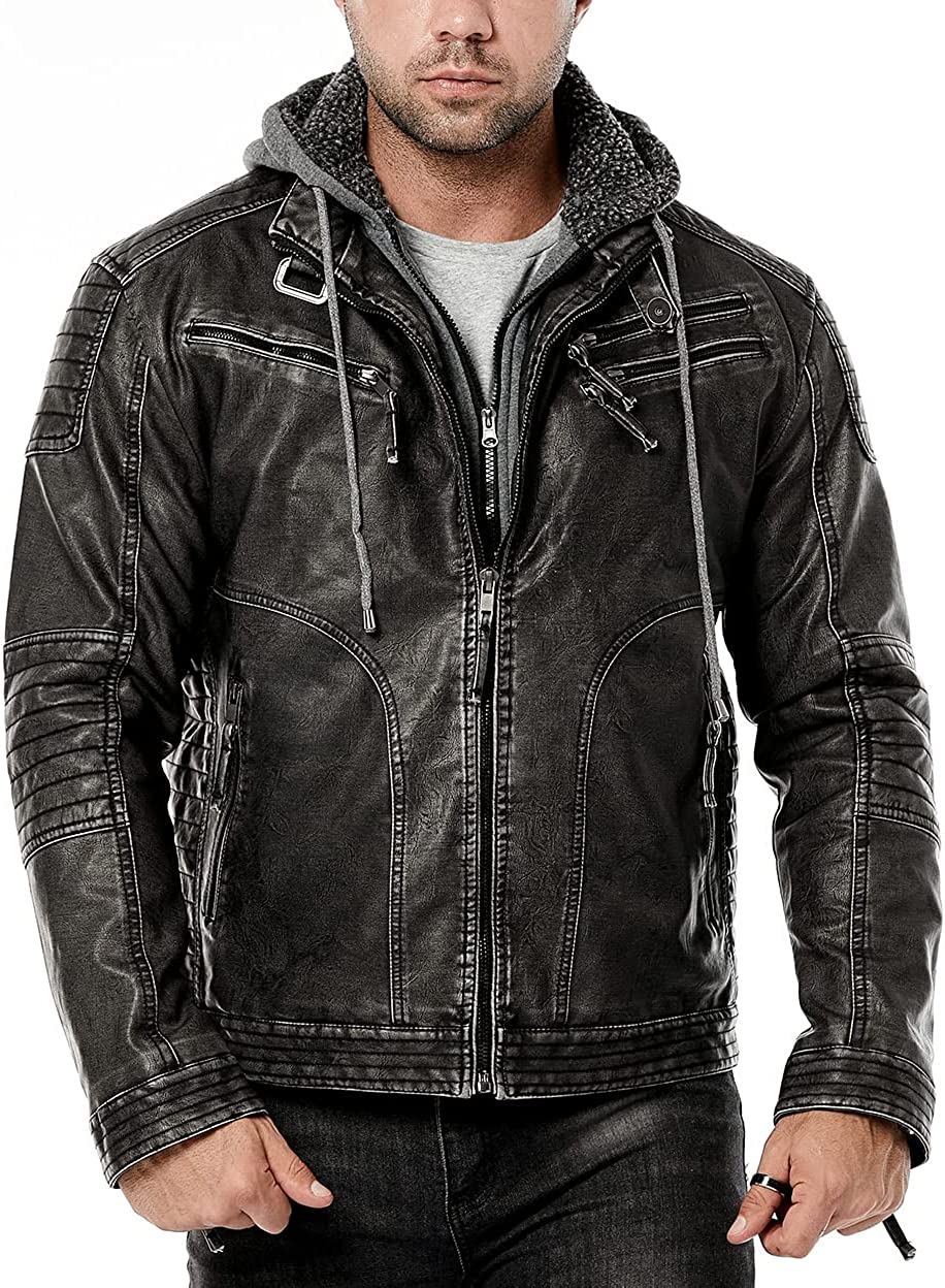 Removable knitted hood with placket and out zip closure placket provide great wind resistant, and can be worn as a stand collar motorcycle jacket