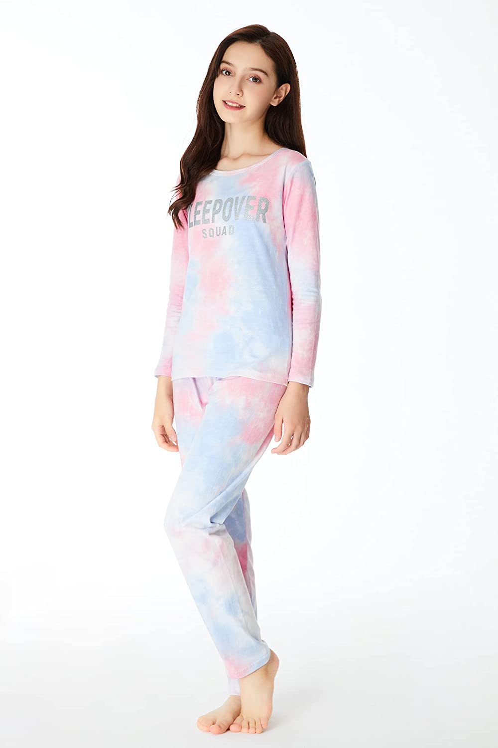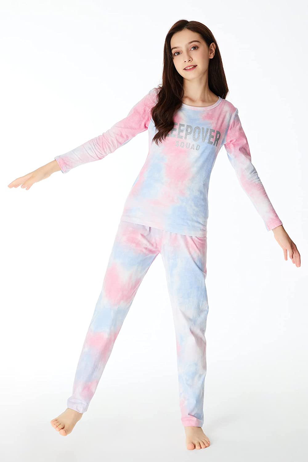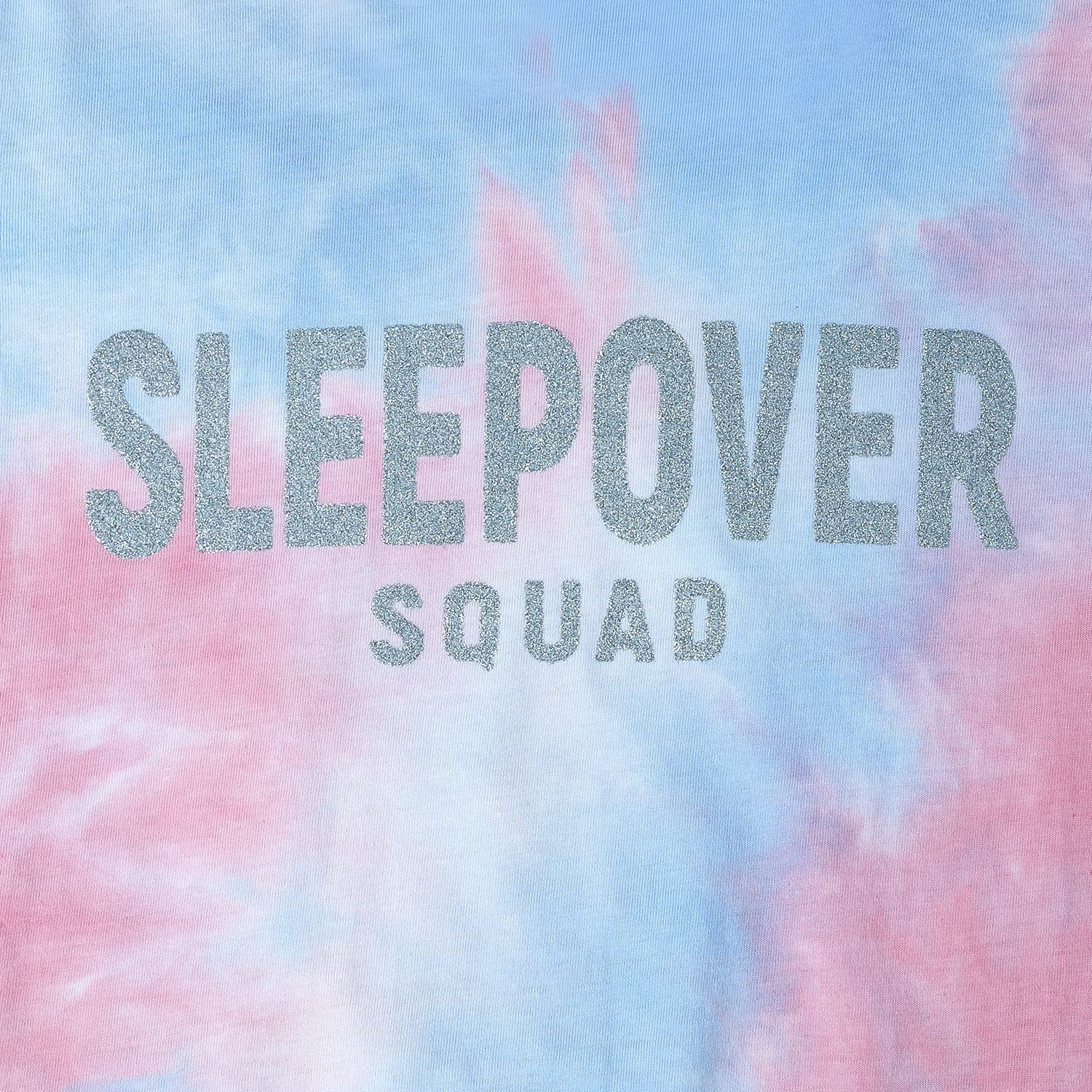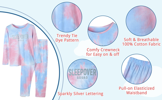 • 【Feature】 These Kids Pajamas feature mottled colors of pink, white, and blue with pretty ‘Sleepover Squad’ sparkly silver lettering.