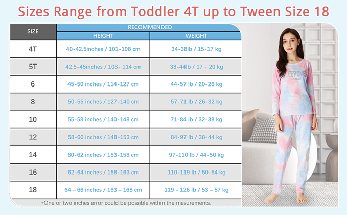 • 【Sizing & Fit】 Please choose your size referring to our size picture on the left. These girls’ pyjamas are with standard US Kids Sizes 6, 8, 10, 12, 14, 16, 18 to choose from. Relaxed and regular fit.