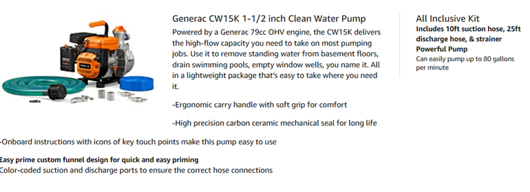 Generac 6821, Clean Water Pump, 1.5-inch, with Accessory Kit , Orange