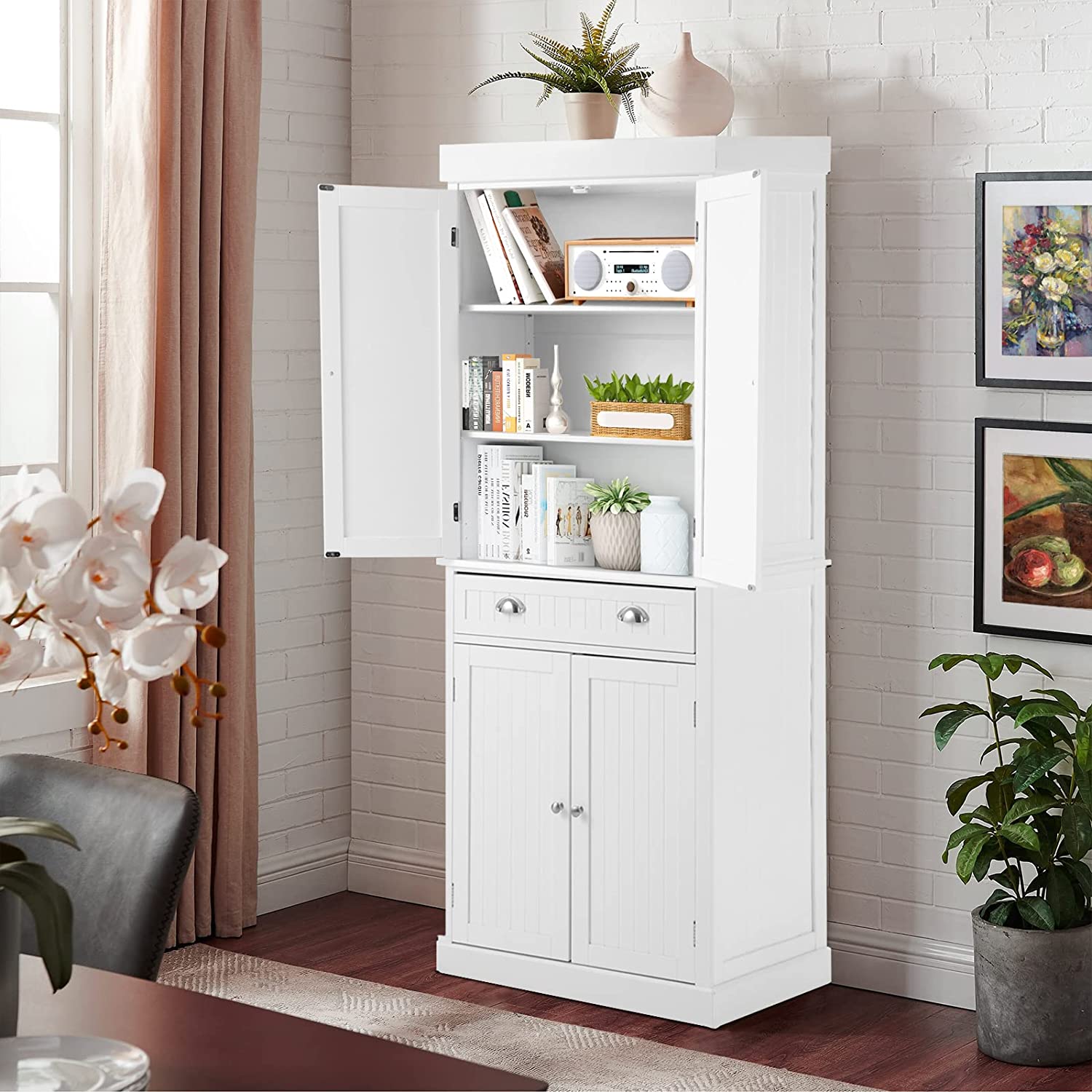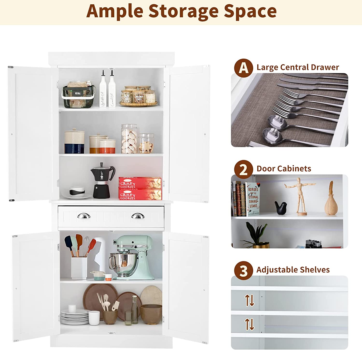 【STORAGE SPACE TO MEET DEMAND】This kitchen pantry is equipped with a large drawer and 2 double-door cabinets. There are three adjustable shelves inside the cabinet, and you can easily adjust the height of the shelves according to the different items you need to place. Different heights can meet the placement needs of various items. The drawer is equipped with smooth sliding rails, which can be easily opened and closed. You can put dishes, books and other small items in the spacious drawer.
