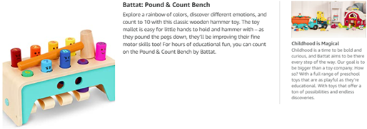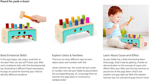 Peek-a-boo! The Pound & Count Bench by Battat comes with 10 colorful pegs and a tiny hands-friendly mallet to pound them down with. As your kiddo plays with this wooden pounding toy, they’ll be getting a hands-on lesson on the concept of cause-and-effect – when they tap the hammer on a peg, they’ll see another one pop up! Your little one can explore numbers, colors, and emotions with these fun pegs. With 5 different facial expressions to discover, this developmental toy can be used to build your kiddo’s emotional skills! When play time is over, easily store the mallet in the holes on either side of the bench. Made of worry-free and durable materials, all Battat products meet or exceed EU, U. S. and Canadian safety standards.
