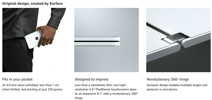 Two ultra-thin, high-resolution touchscreens open to reveal new possibilities on a mobile device. Designed to help you be productive, Surface Duo features multiple modes, the best of Microsoft 365 mobile experiences, every Android app in the Google Play store, and new dual-screen enhanced apps. Now you can view two apps at once or span one across both screens, drag and drop between screens, and make phone calls. Say goodbye to constant app switching.