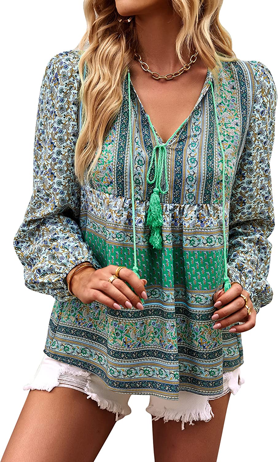 Features: Fresh and stylish style, sexy v-neck, 3/4 sleeve, elastic cuffs, loose fit, floral print top, decorative buttons, flowy hem, super cute.