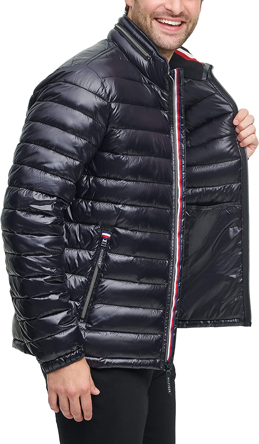 This water resistant wet look polished nylon puffer jacket is filled with a lightweight Ultra Loft down alternative filler for lightweight, comfortable warmth. This features a hidden hood inside the collar. There are two lower zipper pockets for storing personal belongings. There is also a signature red, white, and blue rib knit trim inside the collar for comfort and style as well as a rubber Tommy flag patch at the left arm and embroidered flag at the left chest.