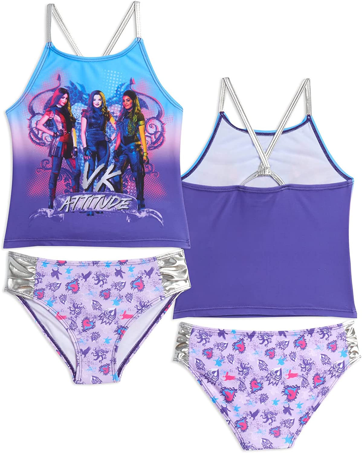 • Featuring villains Mal, Evie and Uma with the words "VK Attitude" and dragon heart in background on purple gradient top; All-over print of themed icons on bottoms; Silver foil straps on tank and bottom ruched sides