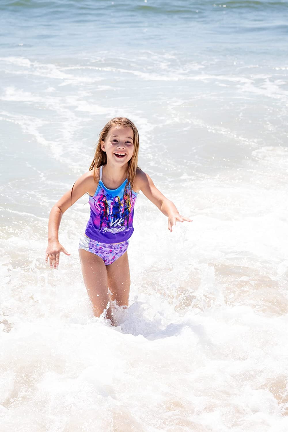Leap into the magical world of fantasy and explore the kingdom of Auradon—home to Disney’s classic fairy tale characters and their children! While the fairies, princesses, princes, villagers and general good guys have lived in harmony under the rule of Belle and Beast, the villains have been banished to the Isle of the Lost. But their children now have the chance to be better thanks to crown prince Ben, and they need your help! Join Jay, son of Jafar; Carlos, son of Cruella de Vil; Evie, daughter of the Evil Queen; and Mal, daughter of Maleficent, as they navigate high school at Auradon Preparatory and figure out just how good and just how bad they want to be. Get ready for the storybook adventure of a lifetime with this Disney Descendants Tankini Top Swimsuit & Swim Bottom Set. Your little one will love this bathing suit swimwear top & full coverage swim bottom Set so much that they will always want to wear it.