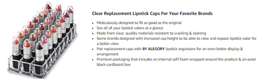 These BY ALEGORY premium designed clear lipstick caps are made to help you see your favorite lipsticks at a glance. Showcase your lipstick colors for a more vibrant vanity and never waste time looking for your favorite color again! This listing is specifically designed for the titled lipsticks. These caps are the exact size & fit as good as the original.