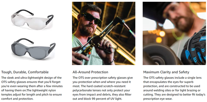 The Pyramex OTS (Over the Spectacle) safety glass is designed to fit over today's prescription eyewearThe OTS over glasses safety glasses offers single lens protection that encapsulates the eye for superb protectionThe lightweight nylon temples adjust for length and pitch for adjustingLenses are coated for superior scratch resistanceLenses provide 99% protection against harmful UV rays.