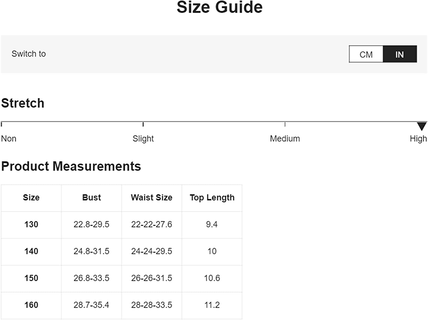 Size Chart:130: Bust: 22.4-27.2", Waist Size: 20.9-21.7-24", Hip Size: 24.8-28", Top Length: 4.1", Bottoms Length: 5.9 / 7.9",140: Bust: 23.6-28.3", Waist Size: 21.7-22.4-24.8", Hip Size: 26-29.1", Top Length: 4.3", Bottoms Length: 6.3 / 8.3",150: Bust: 24.8-29.5", Waist Size: 22.4-23.2-25.6", Hip Size: 27.2-30.3", Top Length: 4.5", Bottoms Length: 6.7 / 8.7",160: Bust: 26-30.7", Waist Size: 23.2-24-26.4", Hip Size: 28.3-31.5", Top Length: 4.7", Bottoms Length: 7.1 / 9.1"