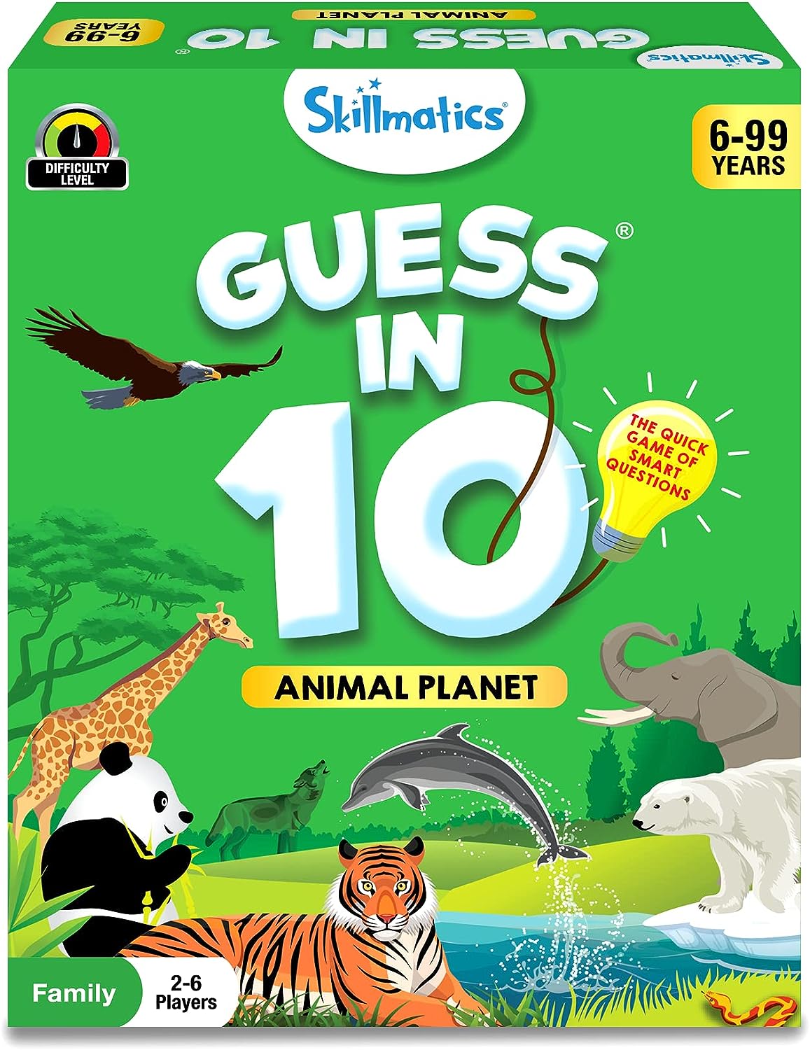 • GUESS IN 10 ANIMAL PLANET CARD GAME OF QUESTIONS - Ask up to 10 questions to guess the animal on the Game Card! Is it a carnivore? Is it a domestic animal? Does it live in groups? Think hard, ask intelligent questions, use your clue cards wisely, and the be the first player to win 7 Game Cards! This game includes 52 Game Cards and 6 Clue Cards.
