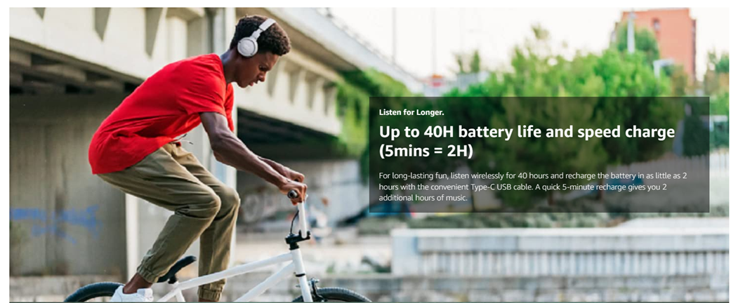 - For long-lasting fun, listen wirelessly for up to 40 hours and recharge the battery in as little as 2 hours with the convenient Type-C USB cable. A quick 5-minute recharge gives you 2 additional hours of music.