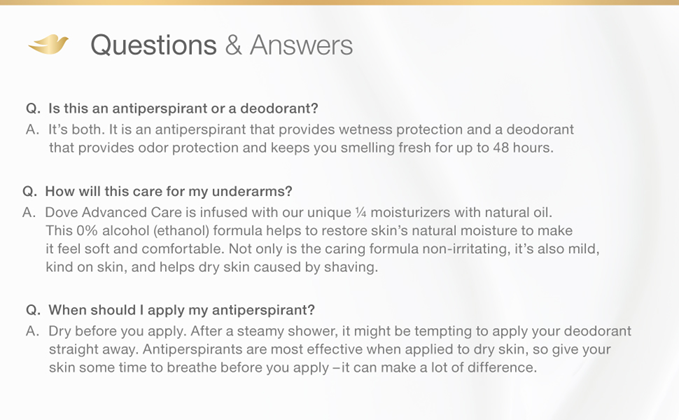 • Certified cruelty free: Globally, Dove deodorant does not test on animals and is certified cruelty-free by PETA
